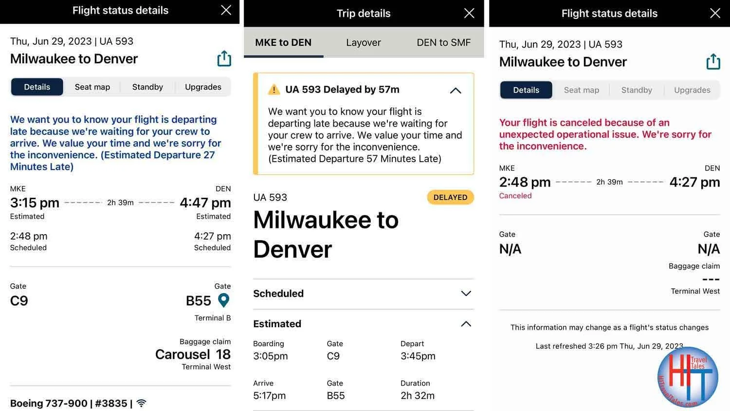 The moving target of messaging delays and cancellations. This was my Milwaukee-to-Denver flight. I always take screenshots of my alerts, especially those that pop up on my app with specific details regarding the reason for delays or cancellations, in case I need to prove something later. The first alert, announcing a boarding delay due to the crew's delayed arrival, came by text. The following alert appeared on my app, with a bit more detail. Finally, the cancellation alert came by text, glossing over the real reason — United could not find its fourth flight attendant.