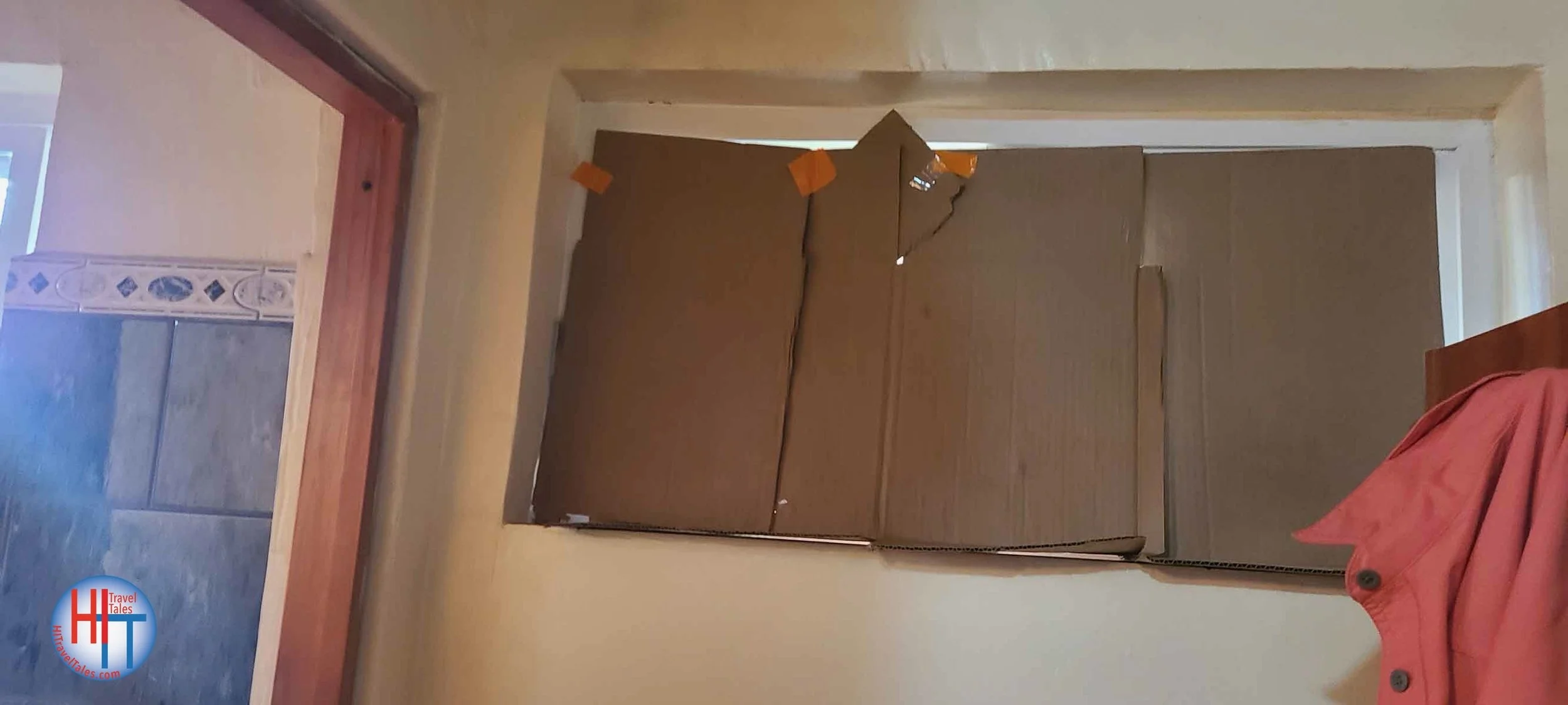 This small window did not have a covering, so I talked to the owner of the small inn and got some cardboard, applying duct tape to help it stay. She left it up since she was aware of it. Note the uncovered window in the bathroom to the left — I just had to close the bathroom door at night.