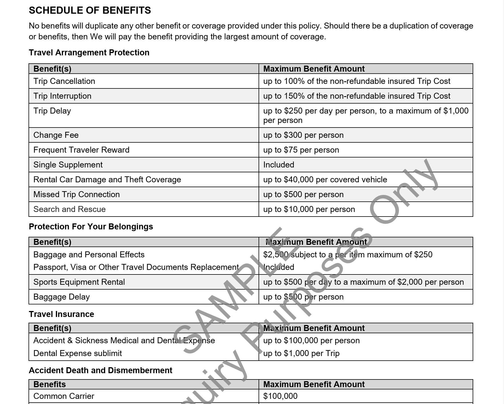 3. Trip cancellation. Look for policies that reimburse you for prepaid airline tickets, hotel rooms, rental cars, tours, cruises, and other nonrefundable expenses if you are unable to travel due to illness or injury, the death of a family member or traveling companion, job loss, military deployment, or jury duty. Trip cancellation coverage should also cover unplanned natural disasters, severe weather, airline strikes, or civil unrest/terrorism events that prevent you from traveling.