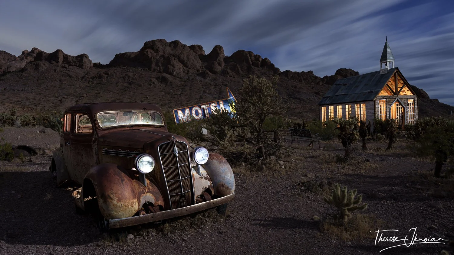 About the cover photo: On a mostly cloudy night, I took advantage of the lack of stars at Nelson Ghost Town in Nevada by underexposing the overall photo with this Cadillac and then throwing some light on just that sexy tail fin. My camera was so low with such a wide-angle lens that I was scrunched down into the dirt behind it – all to capture this really intimate shot of the rear of this vintage pink Cadillac seemingly catapulting into the darkness.