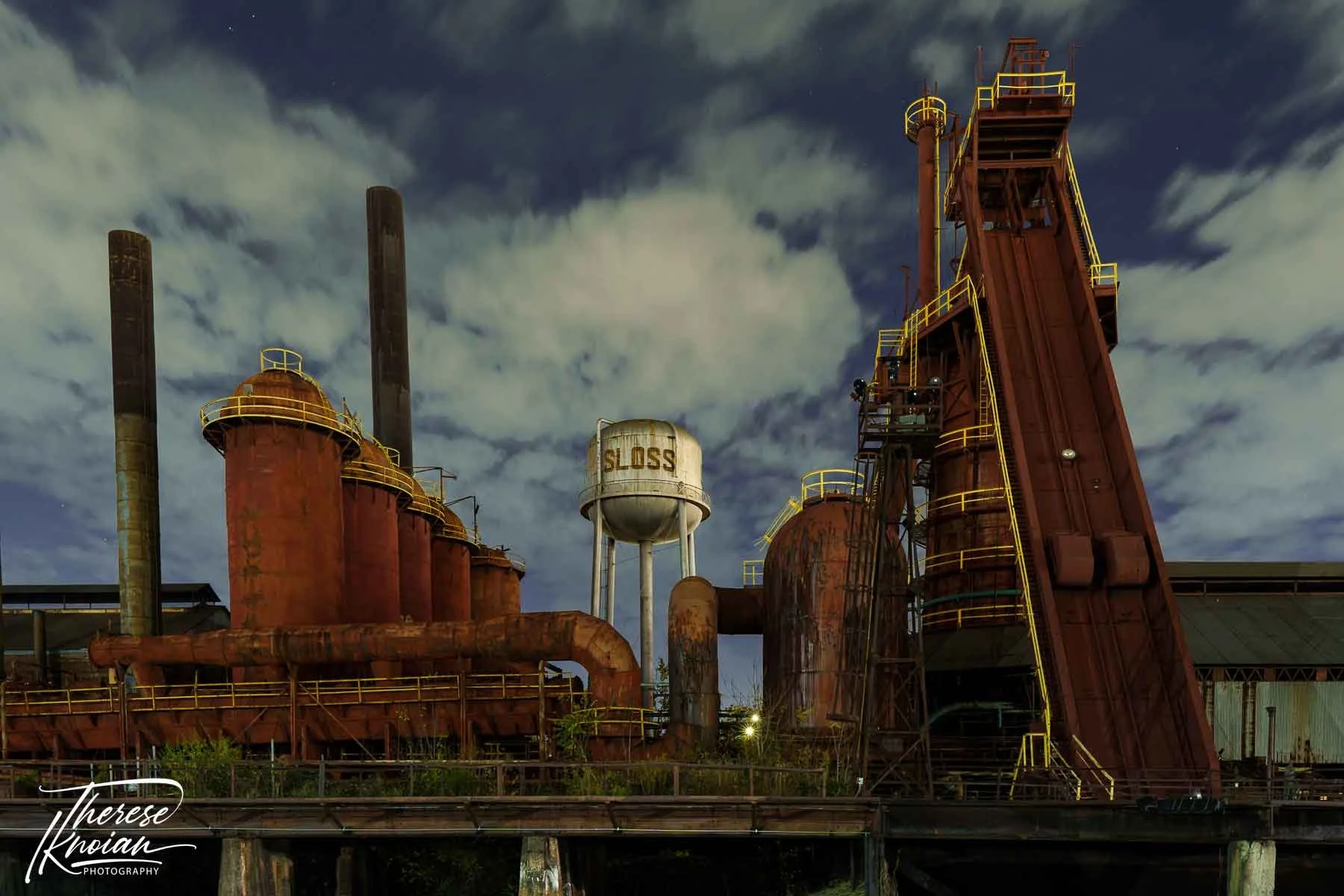 The biggest and perhaps most important industrial history site in Birmingham is Sloss Furnaces National Historic Landmark. Driving along Highway 11, you can’t miss the towering chimneys, rusty furnaces, and abandoned equipment to the south. They rest on the property of what was once the largest manufacturer of pig iron in the world and remains a monument to the Industrial Revolution of the 19th century. I had the pleasure of spending three nights photographing the industrial park; however, a daytime visit will also allow you to wander the walkways to learn about the United States’ history.