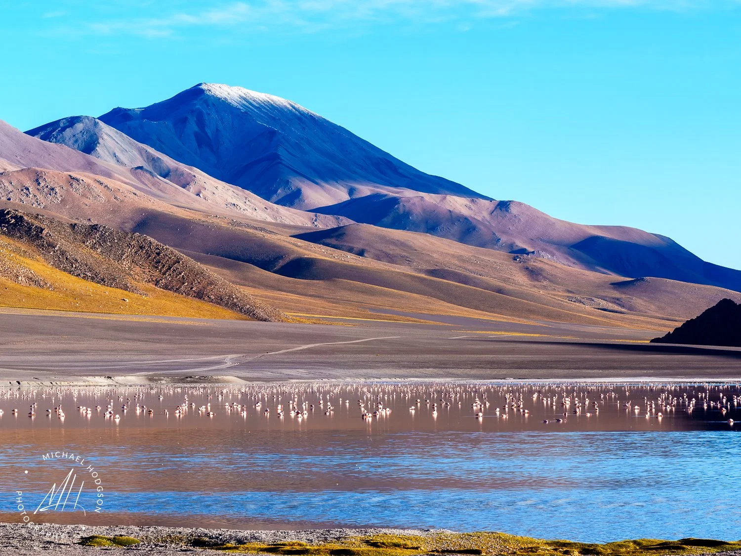 Flamingos and mountains reflected in the calm waters of Laguna Carachi Pampa at dawn.