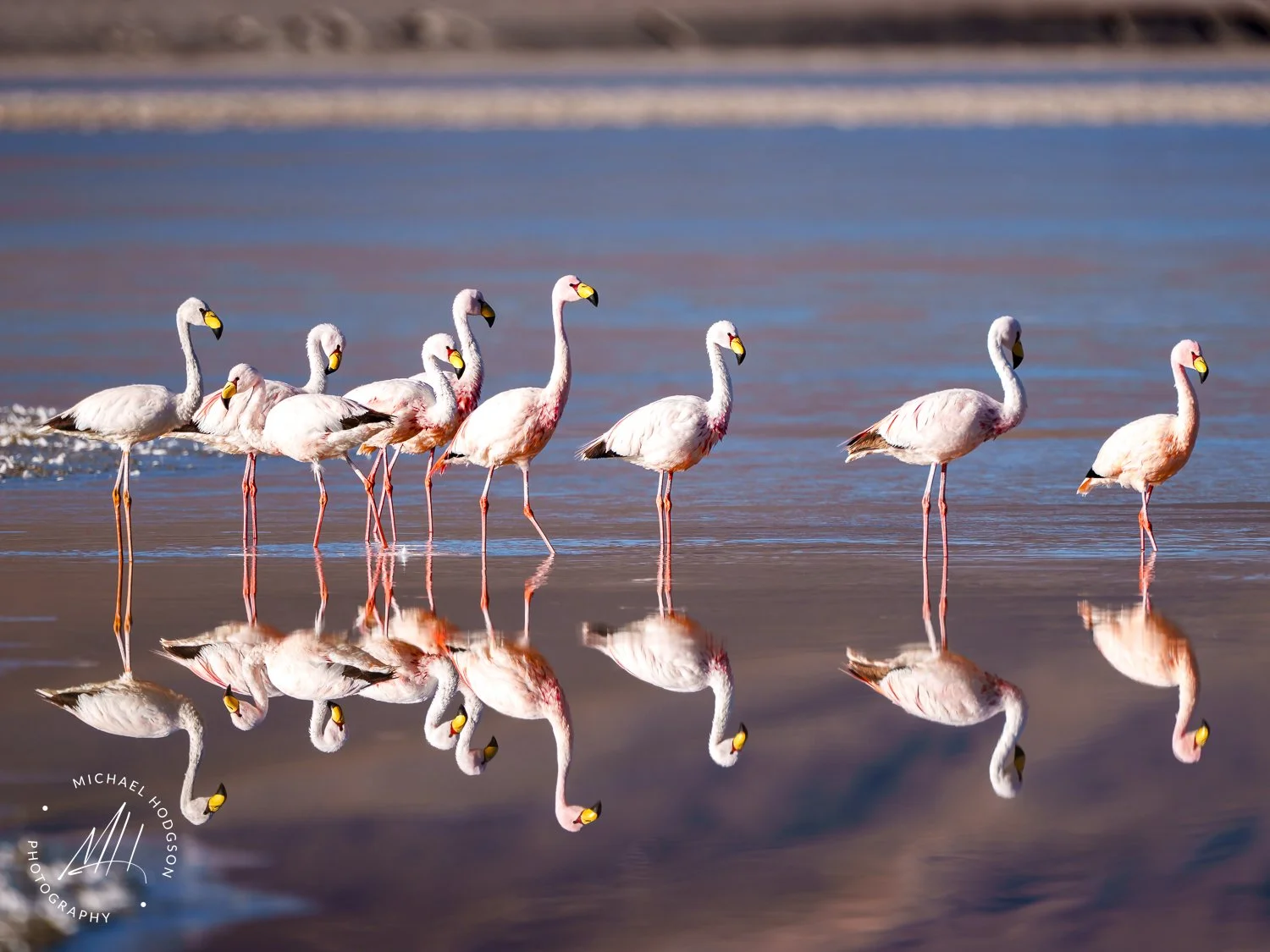 Nine James’s flamingos standing in the still water of Laguna Grande at sunrise. A near-perfect reflection.