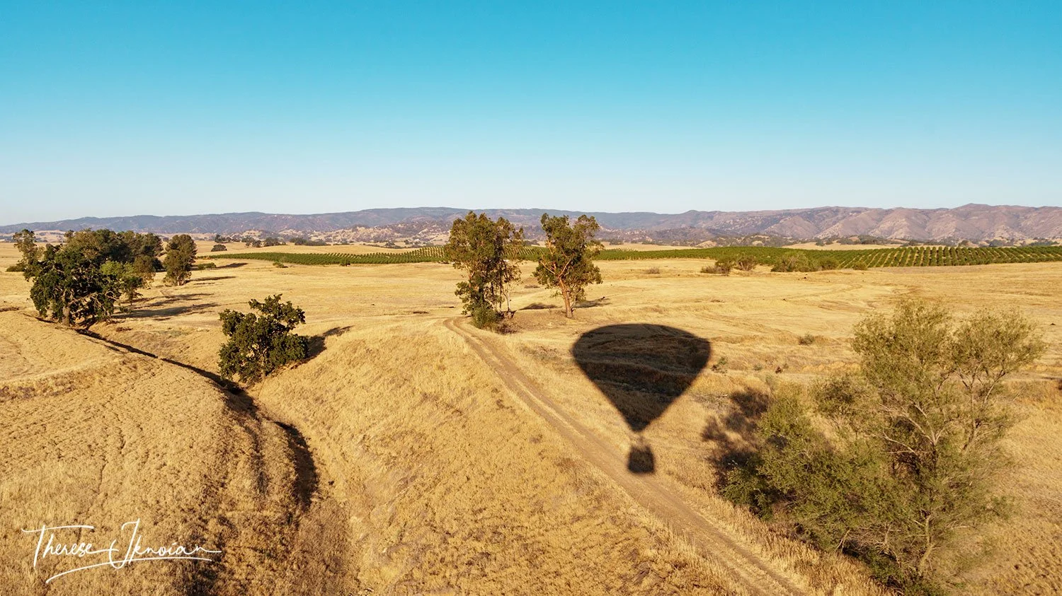 Mike told us we were traveling at approximately nine miles per hour, but I had no concept of speed, other than when watching our balloon's shadow skip across the treetops and grassy fields below. I looked back the way we had come and could see three other yellow shapes lifting into a blue sky, backdropped by hills painted gold in the early morning light. It was picture-perfect.