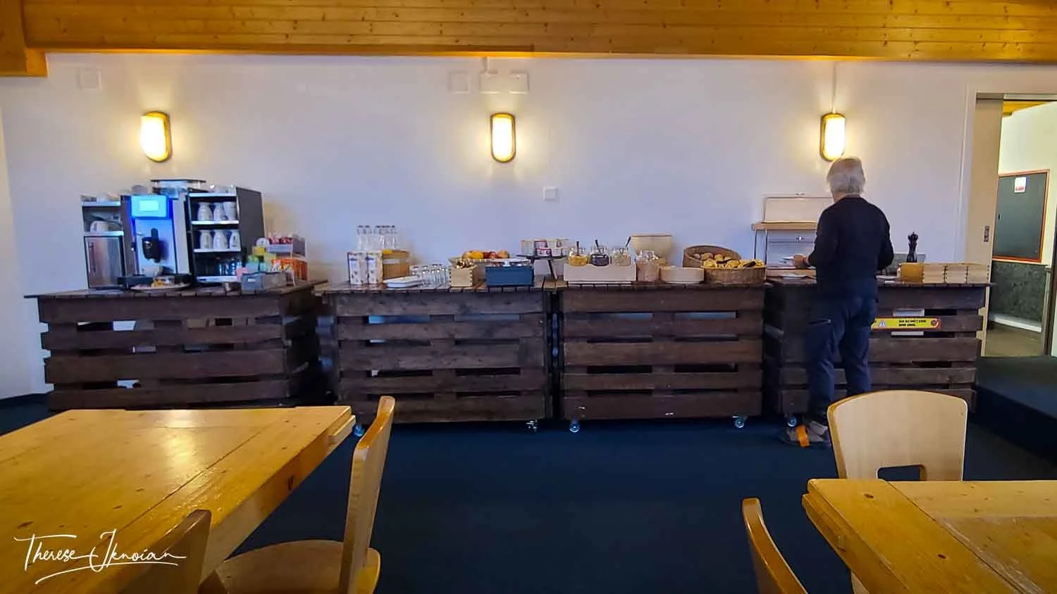Our double room was at the end of the short hallway and featured two single mattresses nestled together to make a double bed in typical Swiss fashion. Furnishings were simple but perfect, with two chairs, a small table, and an armoire. Even a reading light over each side of the bed, and cozy duvets to cuddle in. And the view out the large windows? Stunning! Which is why we were here – and why you too should go to Grindelwald First Mountain Hotel.