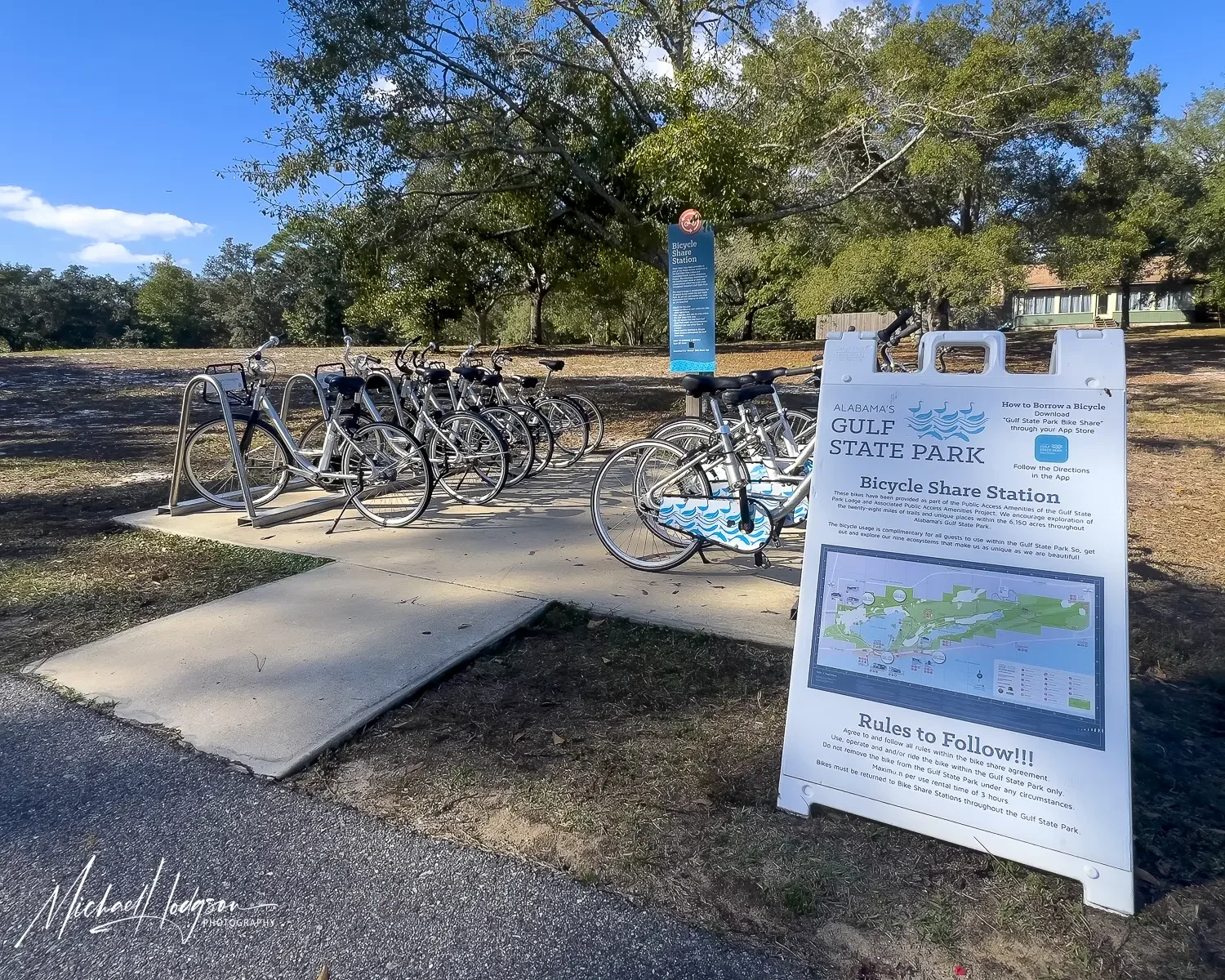 One of a number of Bike Share stations located throughout Gulf State Park. This one is outside the Woodside Restaurant.