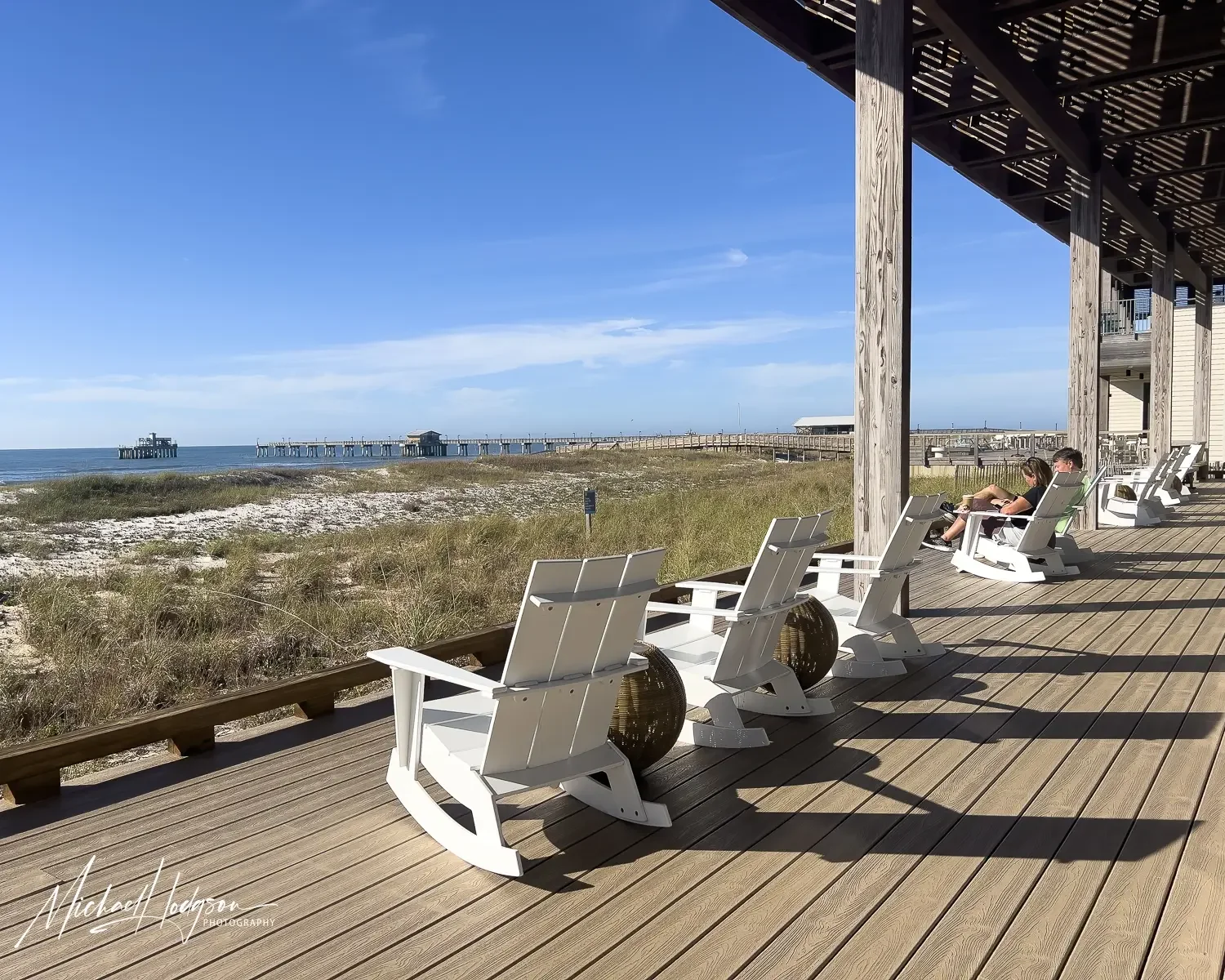 A quiet morning sitting on the deck outside the lobby at The Lodge at Gulf State Park.