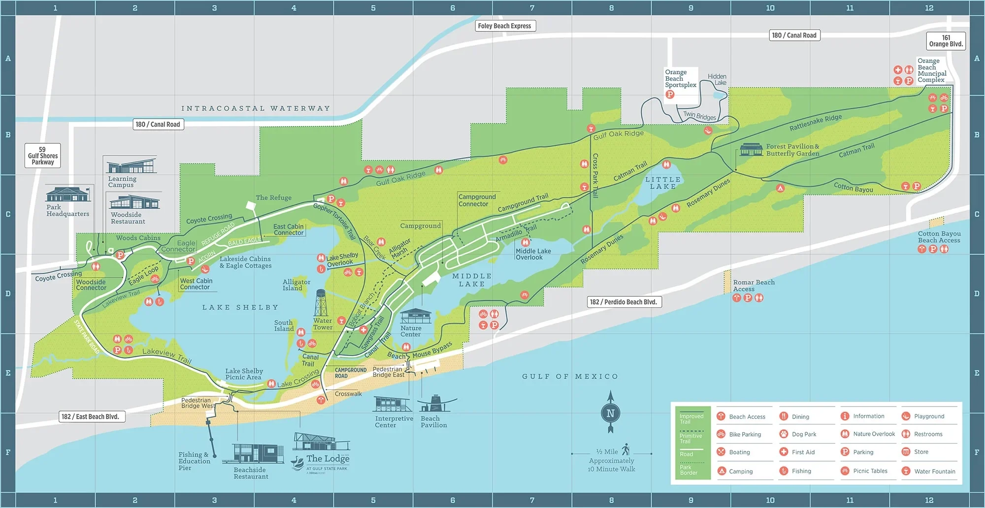 There are numerous places to stay in Gulf State Park, including a campground, a hike-in camp dubbed "The Outpost", and The Cabins, which look to be extremely nice. And there are certainly other hotels near the park's various entrances. But for the best overall experience, as well as superior comfort, I would recommend either The Lodge at Gulf State Park, a Hilton property, or Eagle Cottages at Gulf State Park. Either make a perfect base camp from which to explore the park. Choose The Lodge if you're seeking a more hotel-like experience with full services. Choose Eagle Cottages if you lean more toward a serene and peaceful escape