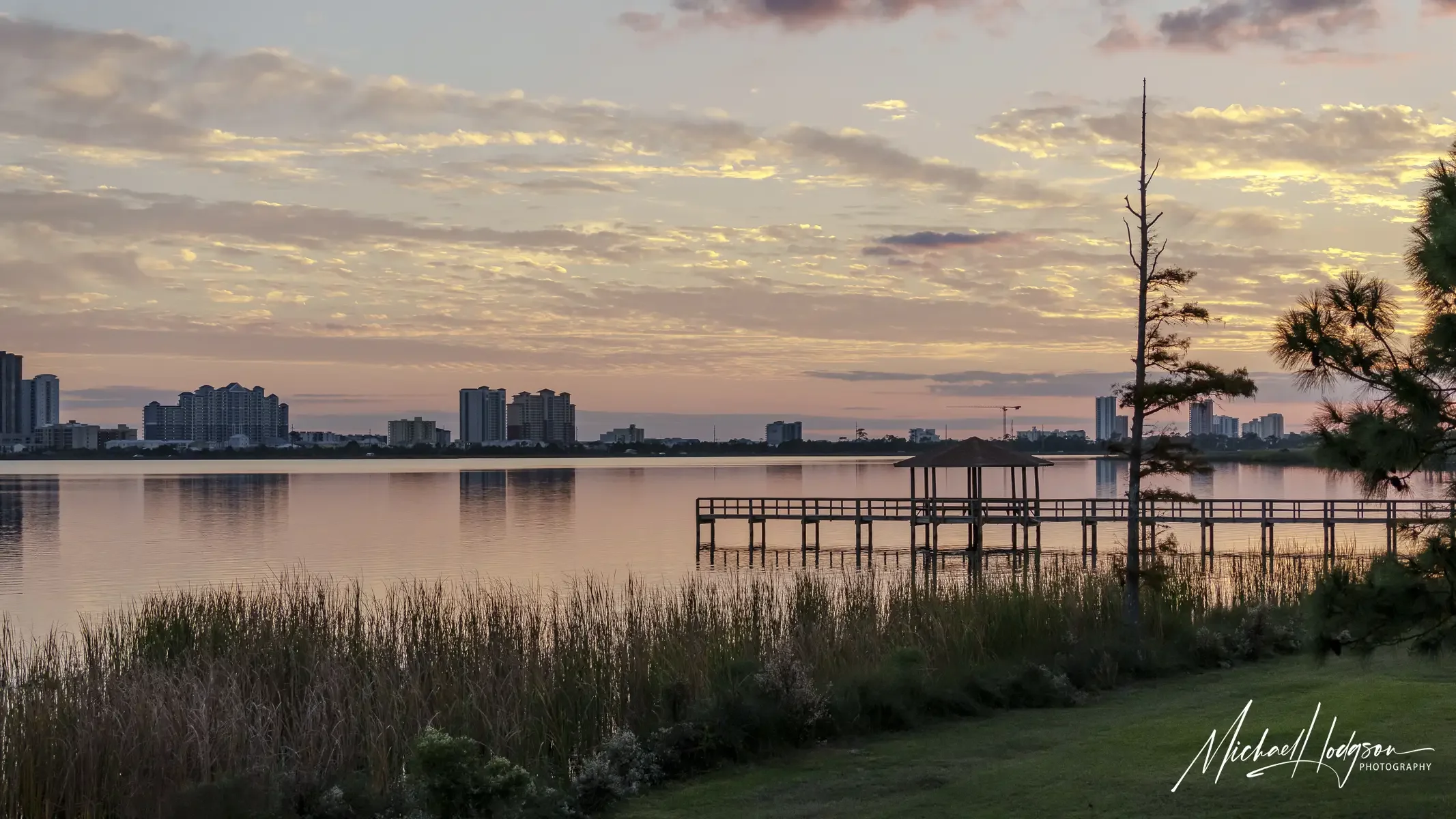 Sunset over Lake Shelby, looking toward the hotels and resorts in Gulf Shores.