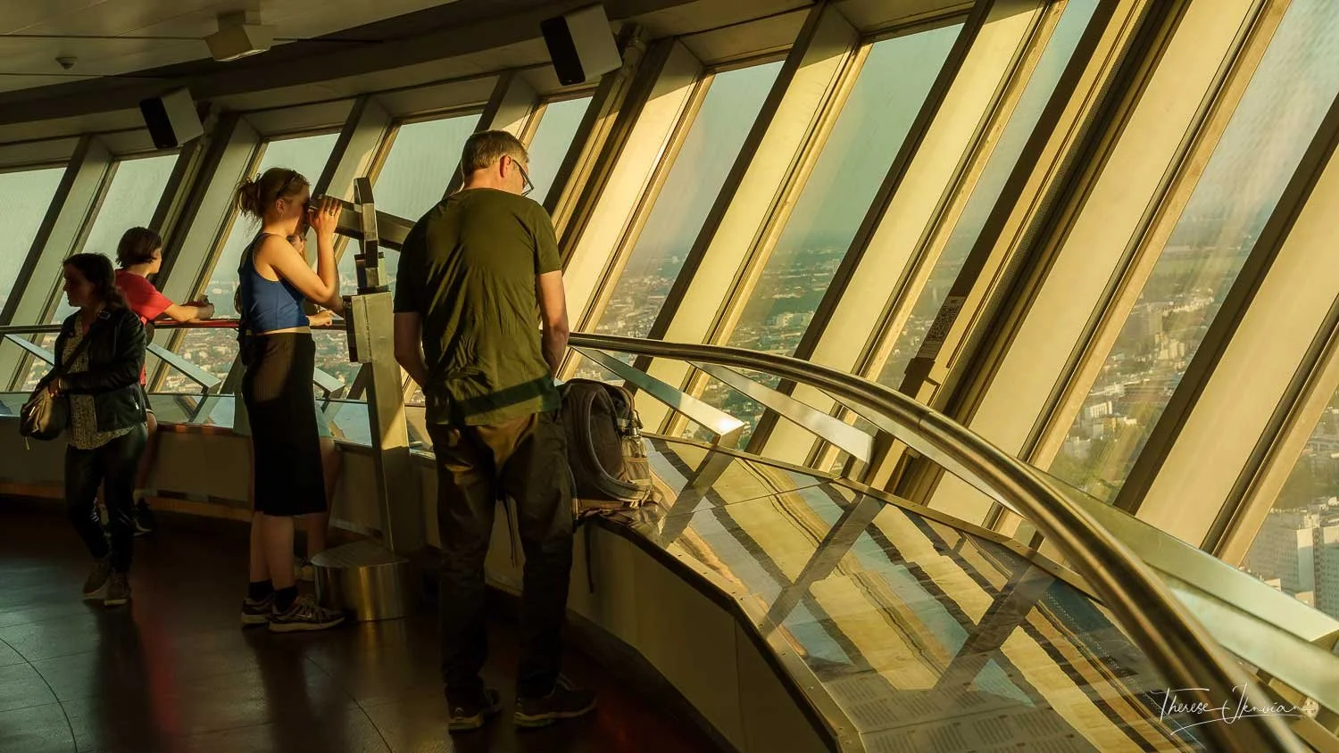 When Therese and I visited in May 2022, we chose an evening time slot to enjoy pre-sunset golden hour and sunset. Once we arrived at our appointed time, we proceeded to security, where our bags were checked, and then we were whisked onto one of the two relatively small elevators – each has a 12-person capacity. The ride is fast – 40 seconds, which translates to 6 meters per second. However, the elevator does go a bit slower (2 meters per second) if it is windy outside because the tower sways. Be sure to look up through the glass ceiling as you zip skyward.