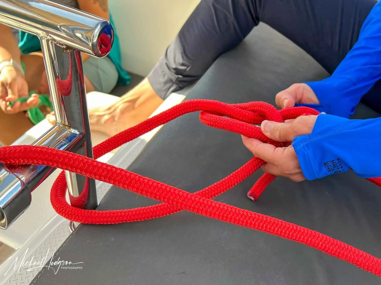 Sometimes anchoring means attaching the boat to a mooring ball — but you have to hook the ball first.