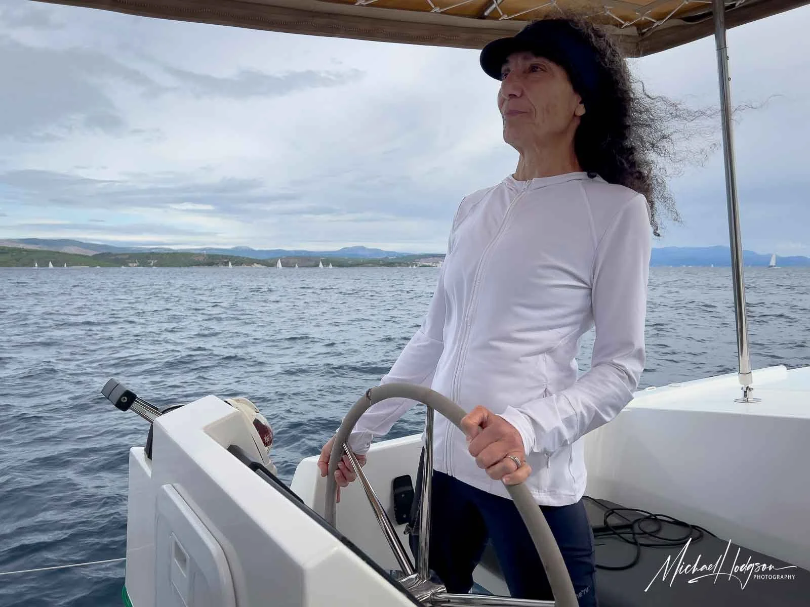 Therese at the helm of the catamaran — looking more confident than she felt!