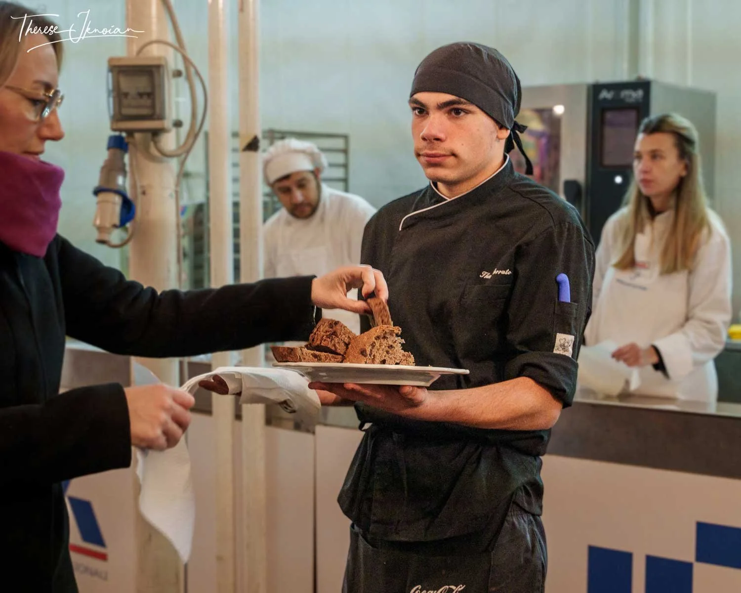 That’s where the real chocolate-infused frenzy began as we queued to follow along some tables as samples of chocolate and chocolate goodies appeared on plates for us to help ourselves. Hands reached from everywhere to grab chocolate goodies. Other students from the school were pulling fresh items out of an oven and offering them to us from platters. Take what you want! Behind the tables and booths in the hall were students from the local cooking school and their chefs making all this chocolate right in front of us to see.