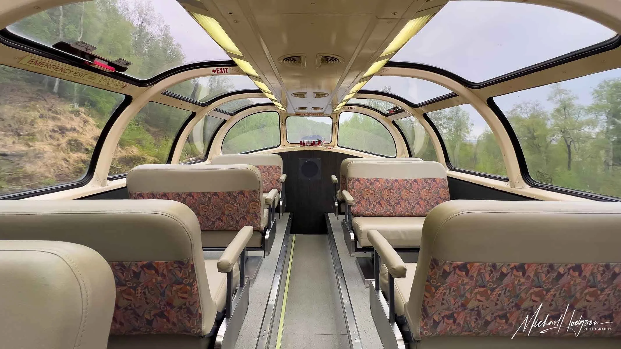 Inside view of an Adventure class railcar on the Alaska Railroad Denali Star train