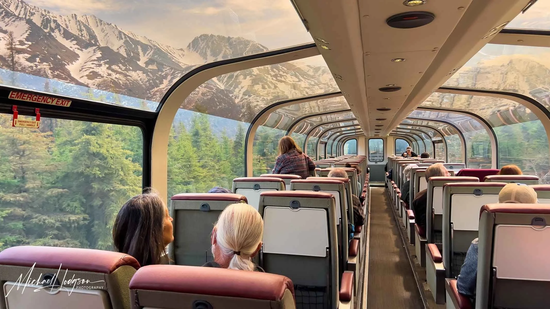 Inside a Goldstar railcar on the Denali Star Alaska Railroad train