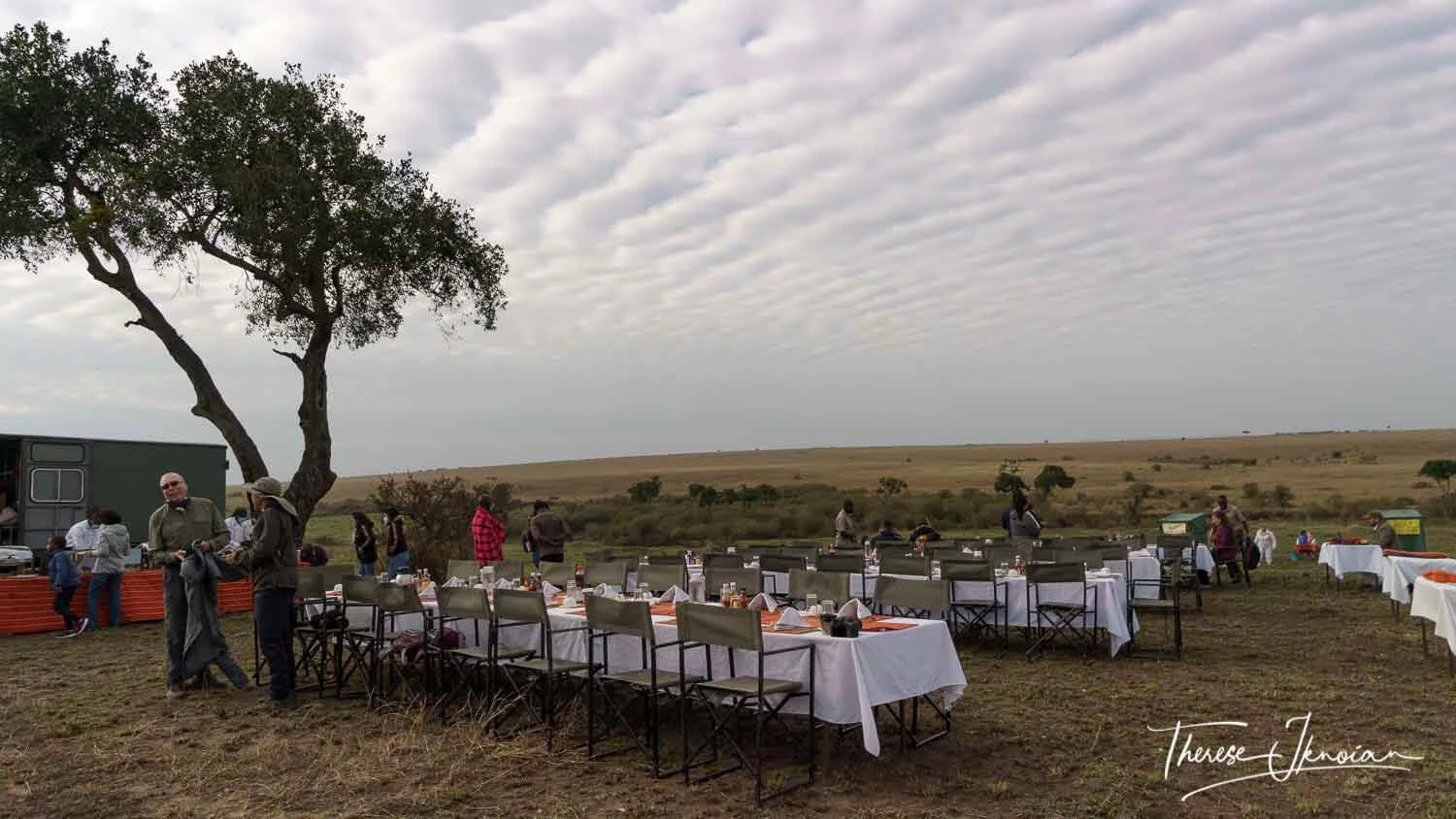 We were joined by the guests from other balloon tours, mingling around tables set with white tablecloths, folded cloth napkins, and silverware. This is not a picnic, but an elegant buffet with chefs taking orders and whipping up omelets, highlighted with bubbly to toast the morning’s hot air balloon adventure over the Mara.